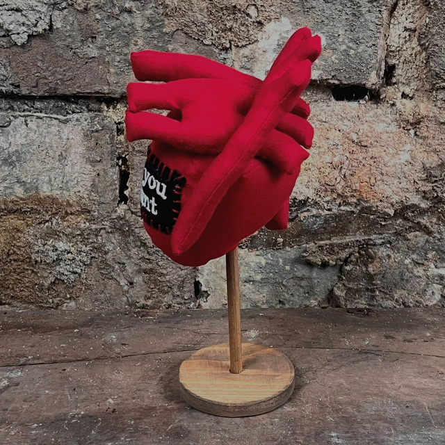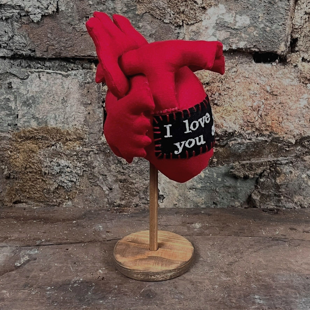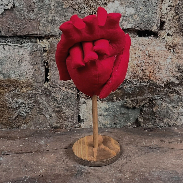 A handmade fabric anatomical human heart displayed on a wooden stand.