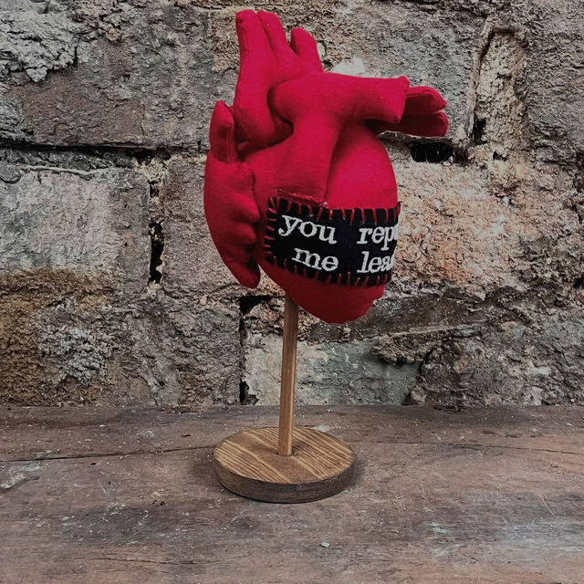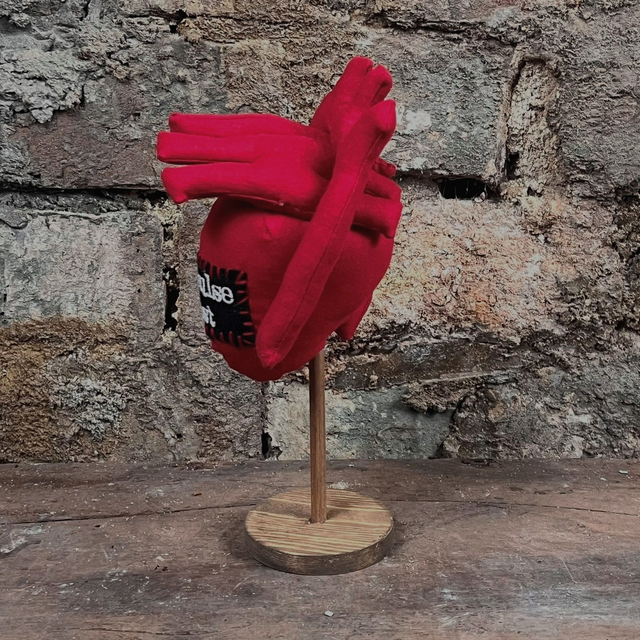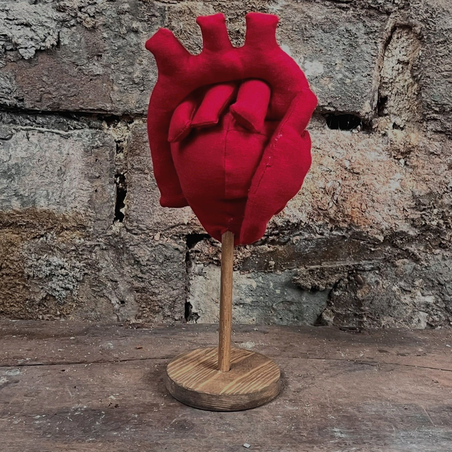A handmade fabric anatomical human heart displayed on a wooden stand.