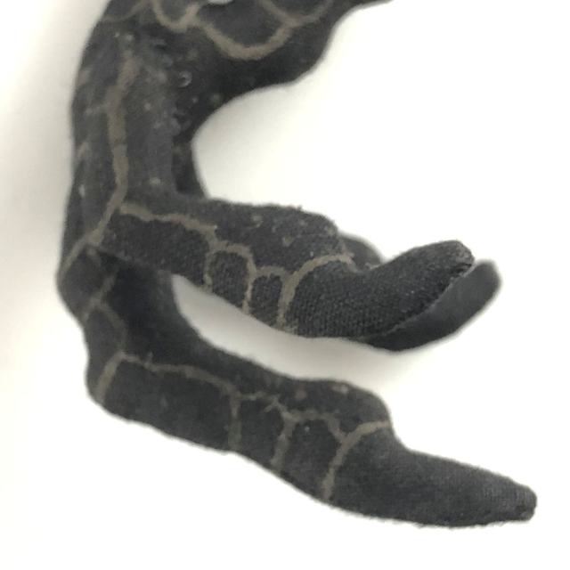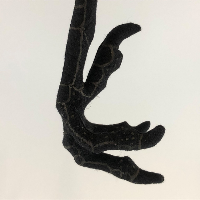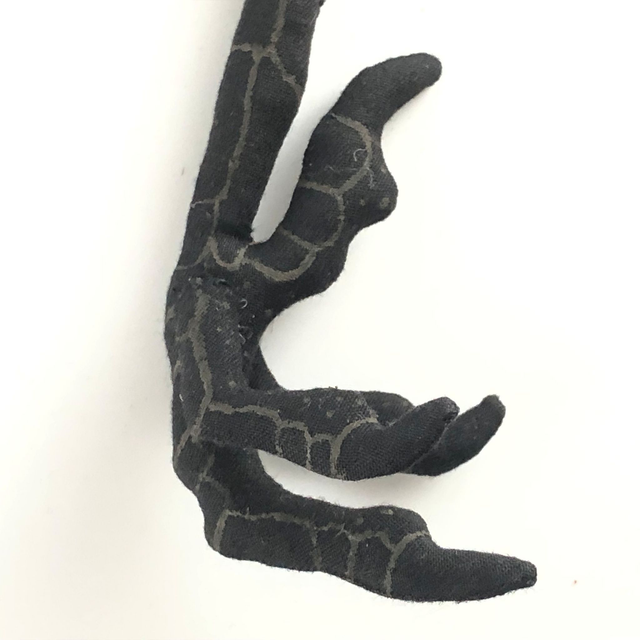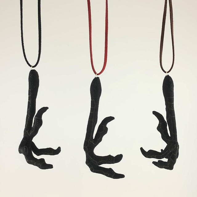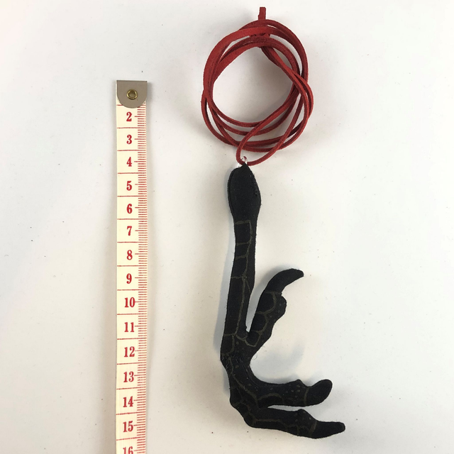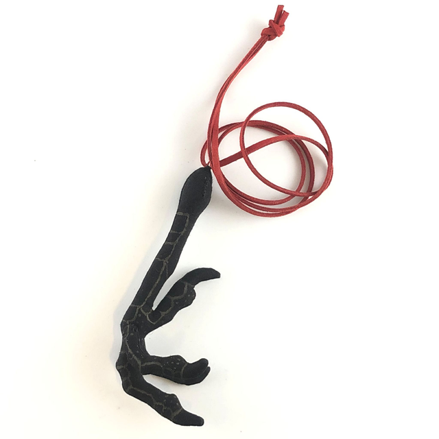This sewn amulet is made from black coloured poly-cotton fabric, I haven't used wire in this soft sculpture piece, so it may require a little bit of gentle manipulation when it arrives. This is a very light item made from fabric and stuffed with stuffing made from recycled plastic bottles or factory waste, depending on availability. The claw hangs from a length of vegan suedette thong in ether brown, black or red. I have added detail in acrylic paint. The little ring is 925 sterling silver.