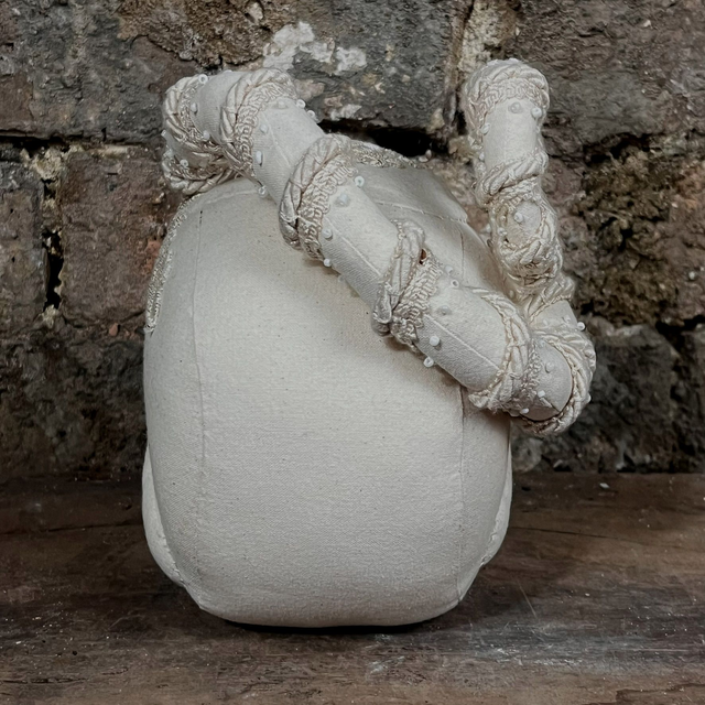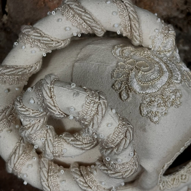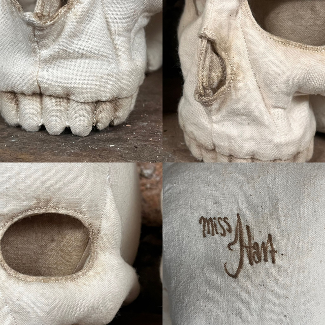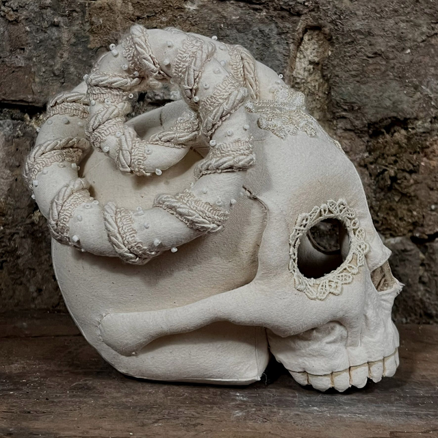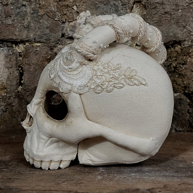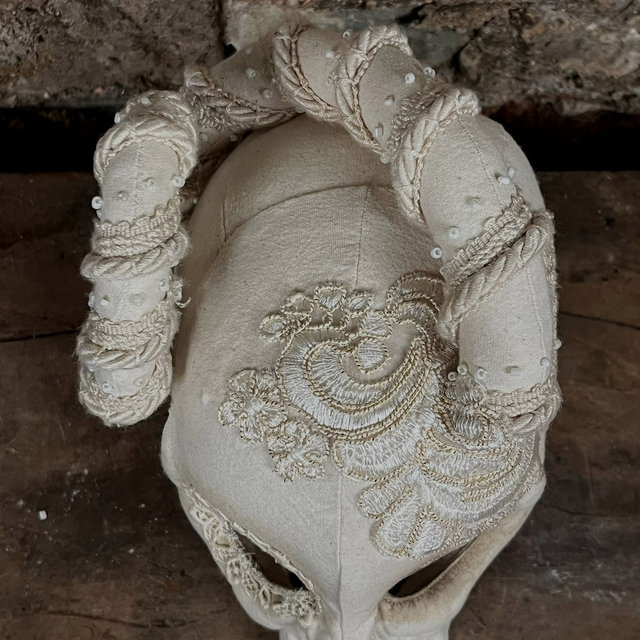 A handmade human skull with a single curled horn, sewn from cotton fabric and vintage lace.