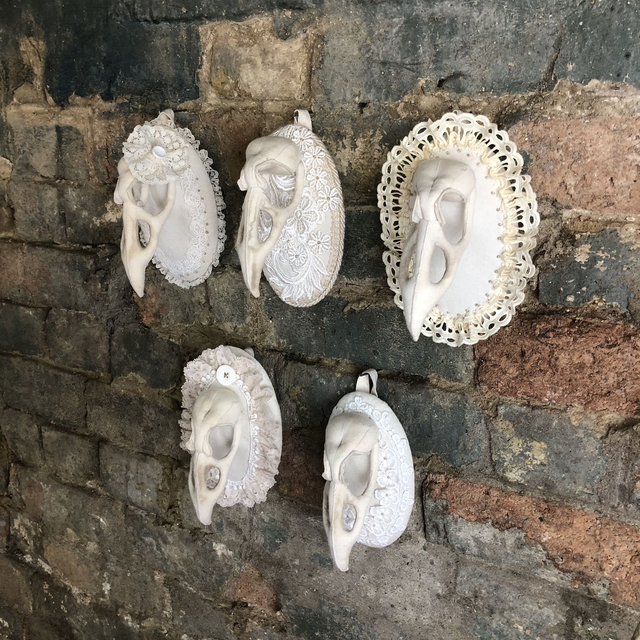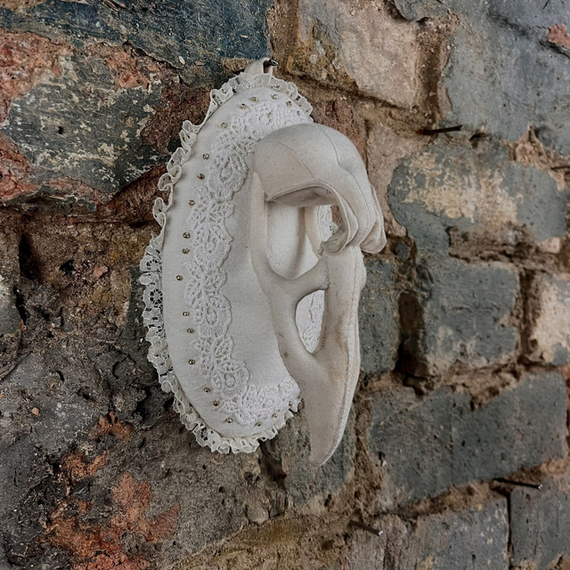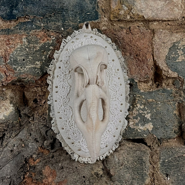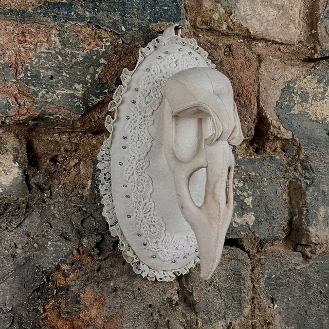 A hand sewn corvid bird skull made from fabric, the ideal gift for a morbid vegan.
