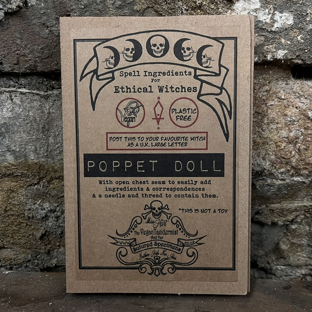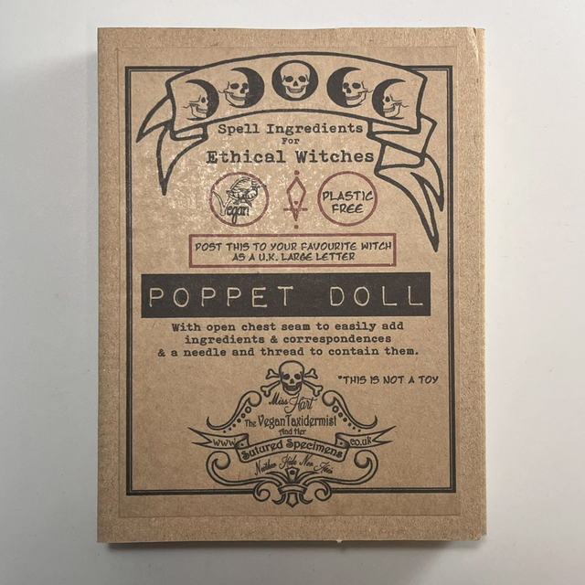 These dolls come in three shades, natural calico, pale brown and dark brown. There is an open chest seam to easily add ingredients & correspondences & a needle and thread (red or Brown) to contain them. These poppets come in a slim cardboard box which is perfect for gifting to your favourite witch as it can be posted by royal mail as a large letter. This doll is 100% biodegradable so you could bury it without worrying over microplastics.