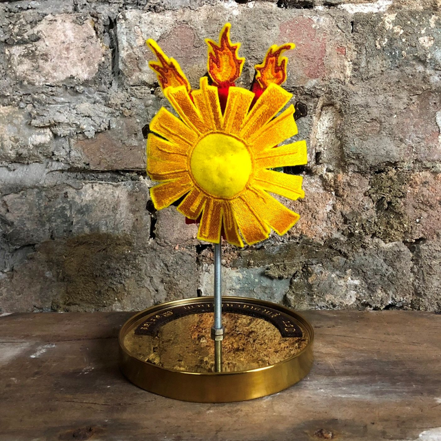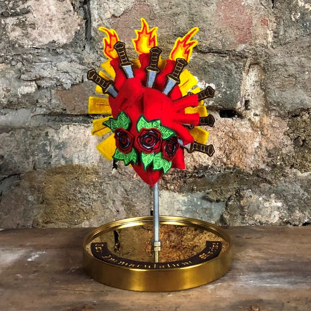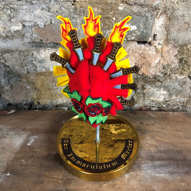 The Immaculate Heart has lots of symbolism, the three flames represent The Holy Trinity (God the Father, the Son and the Holy Spirit) and the transformative power of love, with a sunburst of divine light behind the heart, the seven daggers refer to the seven “dolors”, the seven sorrowful events in Mary’s life. The heart is encircled by a band of red roses. "Cor Immaculatum Mariae" (Latin for “Immaculate Heart of Mary”) is machine embroidered on a label around the base of the heart.