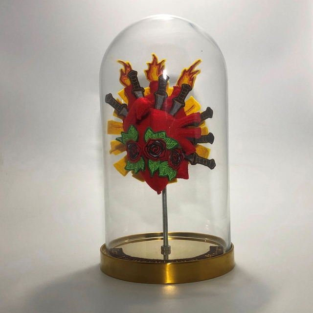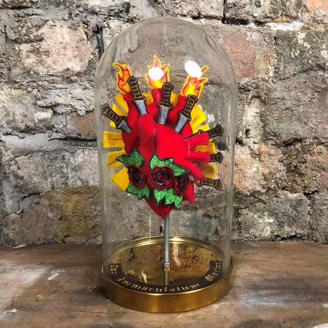 A handmade "Immaculate Heart of Mary" in a glass bell jar.